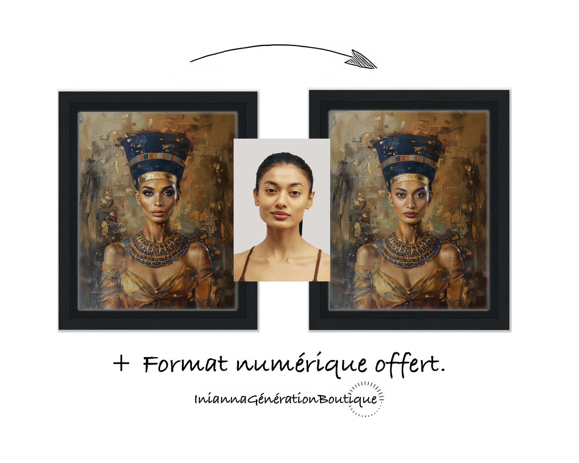 Treat yourself, or a loved one, to a royal portrait inspired by ancient Egypt . Become the modern embodiment of an Egyptian queen, adorned with a majestic headdress, a pharaonic necklace, and a flowing golden gown. This portrait blends luxurious textures and a golden ambiance for a work that is elegant, powerful, and timeless.
