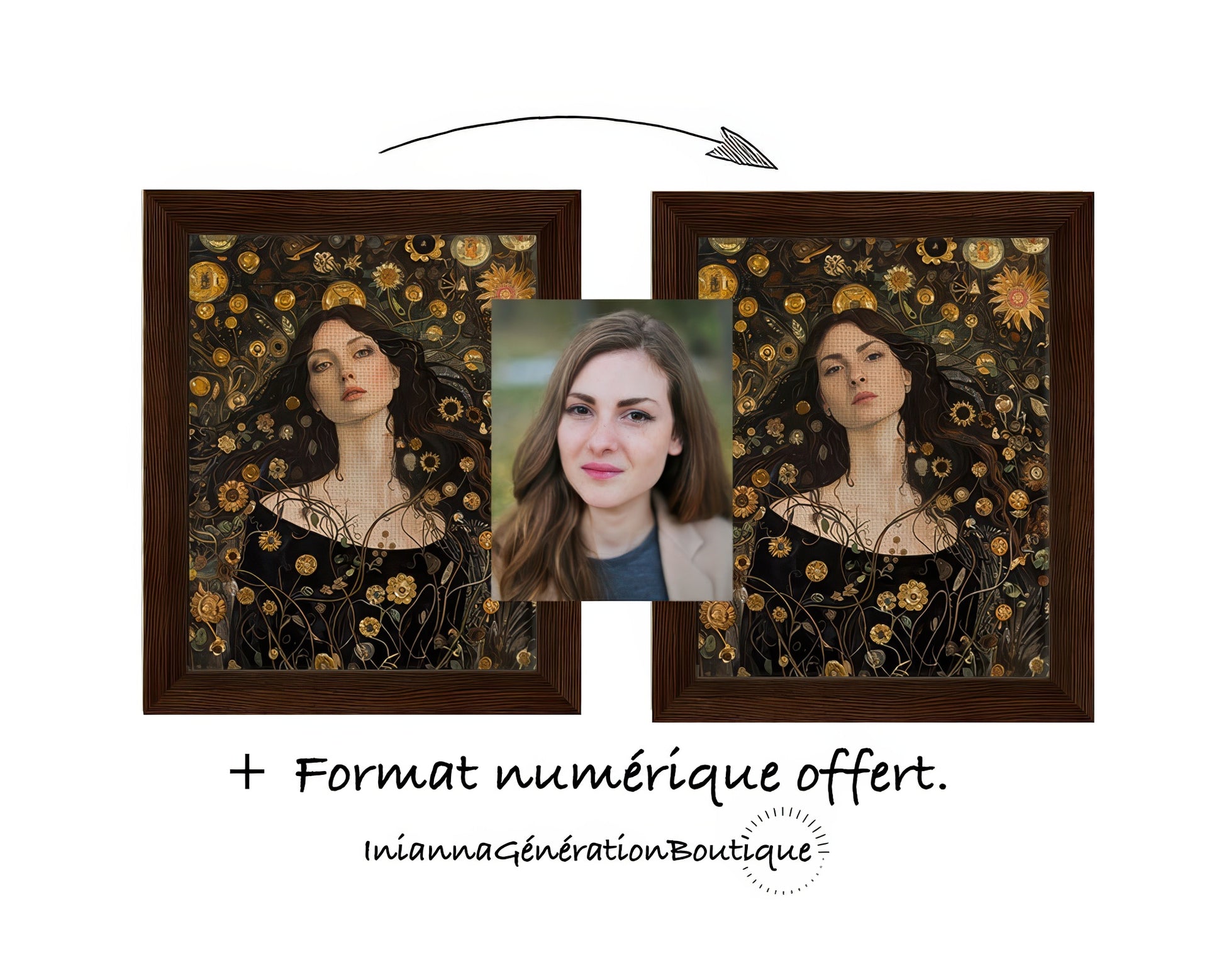 Offrez-vous, ou à un être cher, un portrait poétique inspiré de l’univers enchanteur de Gustav Klimt, maître du symbolisme et des motifs dorés. Les détails dorés scintillants et les fonds floraux ou ornementaux évoquent un rêve éveillé, où l’or et la couleur s’entrelacent pour sublimer la beauté du sujet. Ce portrait artistique d’inspiration symboliste célèbre l’élégance, la sensibilité et la grandeur intérieure dans une composition raffinée et lumineuse. Le cadeau parfait pour célébrer la personnalité et la singularité de celle qui le reçoit, à travers une œuvre empreinte de poésie et de sophistication.