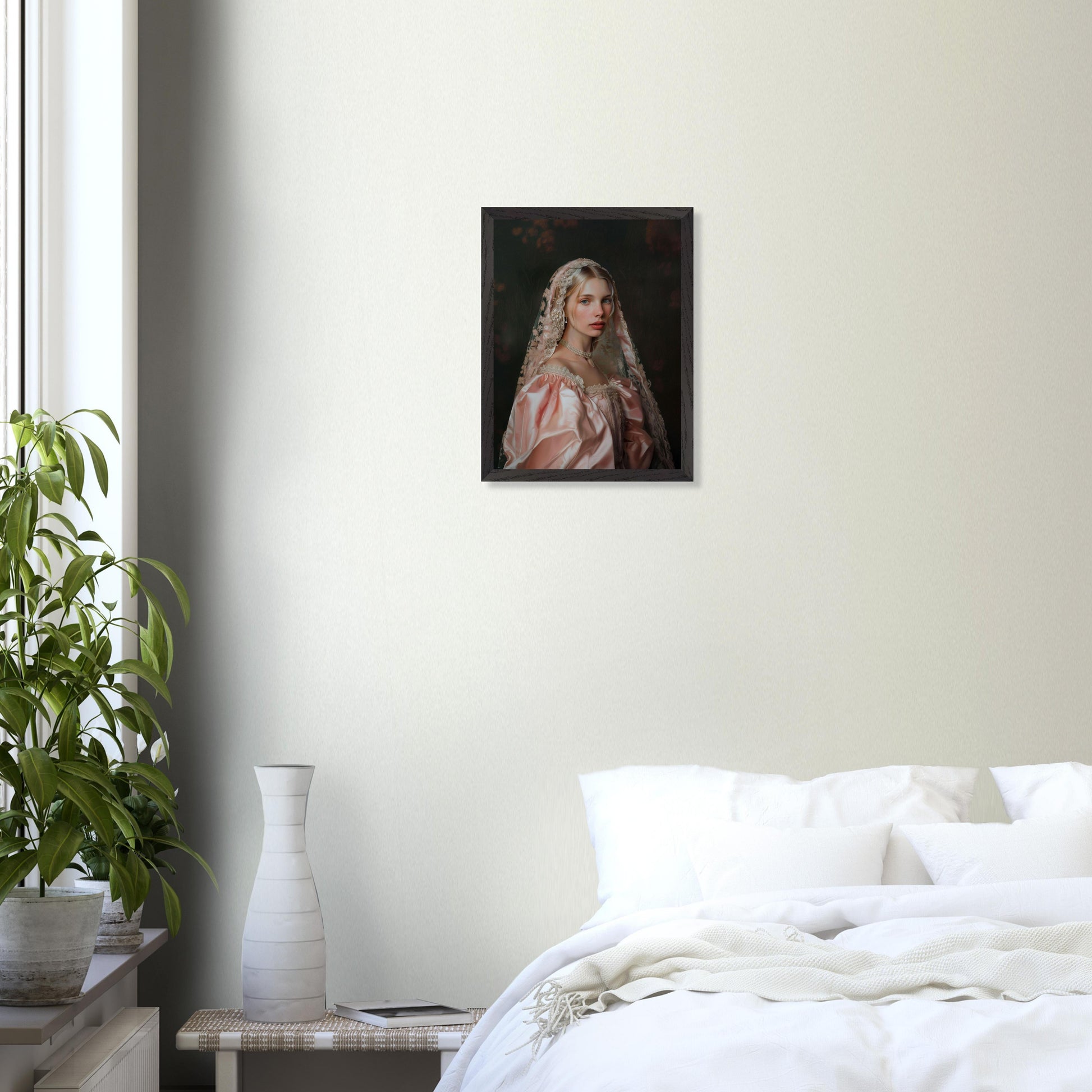 Ce portrait encadré est imprimé sur un papier mat premium 200 g/m², offrant un rendu doux et sans reflet, ainsi qu’une restitution fidèle des nuances satinées, des textures délicates et des contrastes subtils.