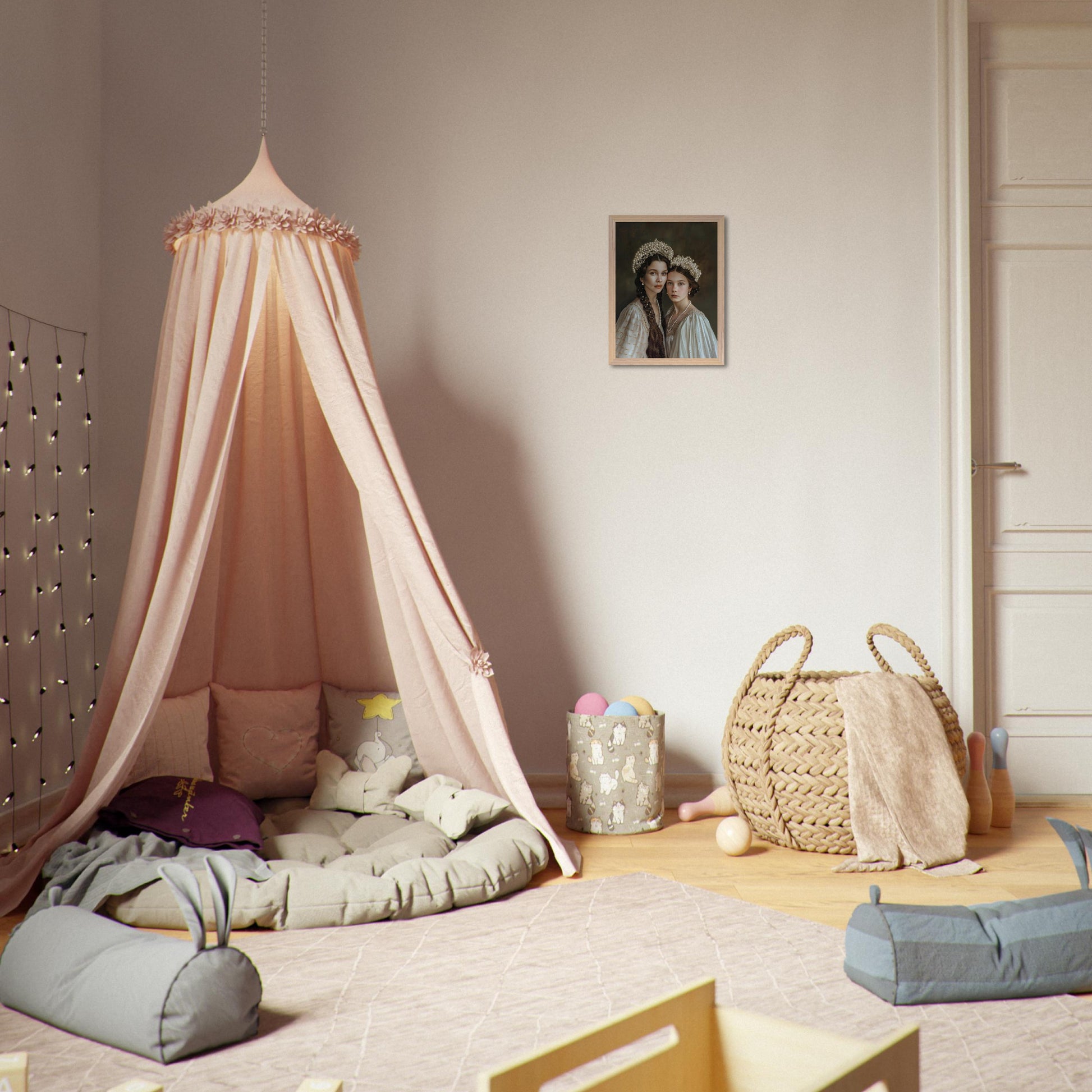 Conçue comme une illustration artistique contemporaine, cette création s’inspire des codes du néo-classicisme, du réalisme délicat et des influences rococo. La composition équilibrée, la finesse des traits et le soin apporté aux matières rappellent les portraits traditionnels, tandis que la douceur des étoffes, la lumière subtile et les détails perlés évoquent l’élégance décorative du XVIIIe siècle.