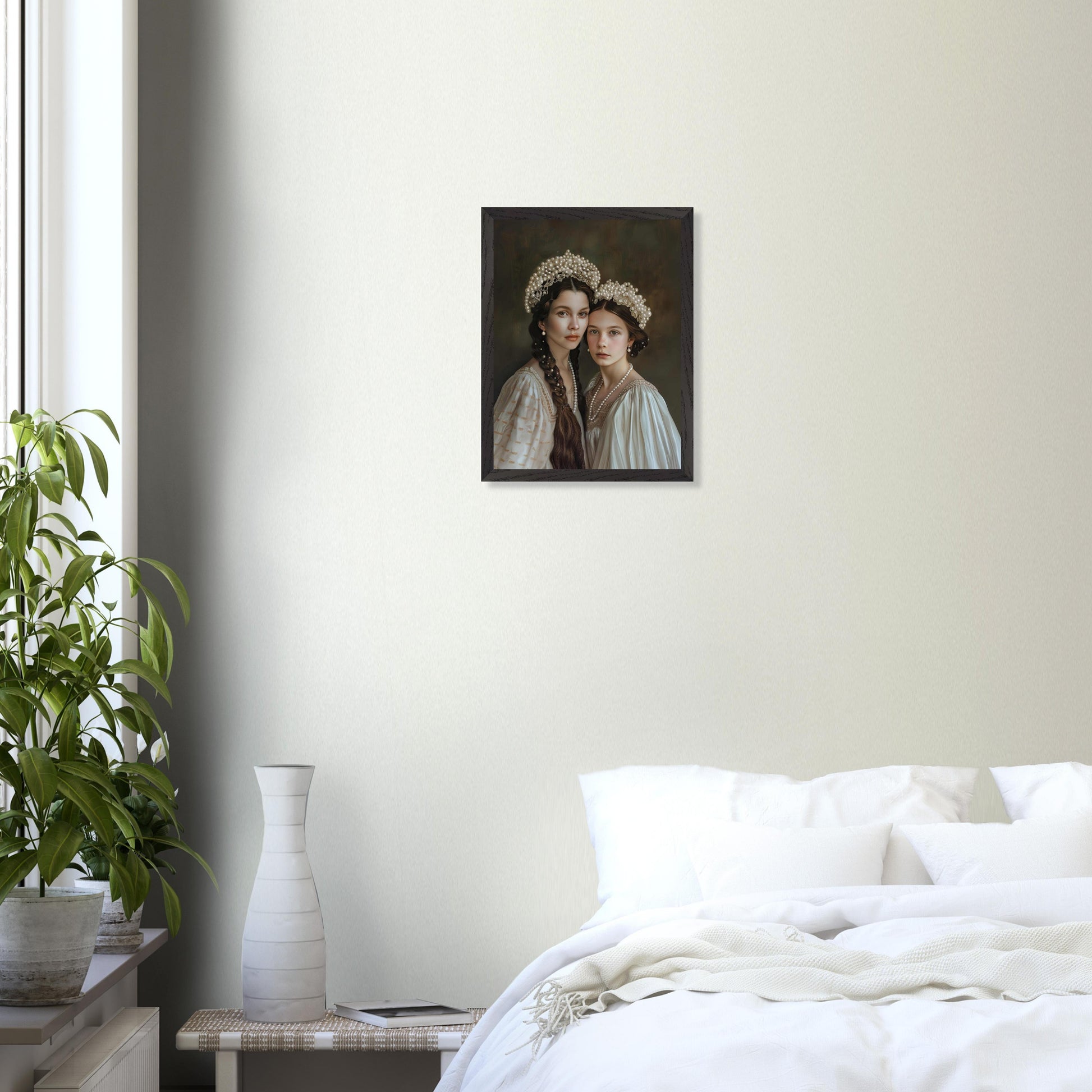 Offrez-vous, ou à un être cher, un portrait personnalisé empreint de grâce classique, où les étoffes ivoire délicatement drapées et les perles majestueuses évoquent une douceur éthérée et intemporelle. Ce portrait sur mesure, baigné d’une lumière feutrée, capture avec poésie votre lien unique et apporte une touche de noblesse raffinée à votre intérieur.