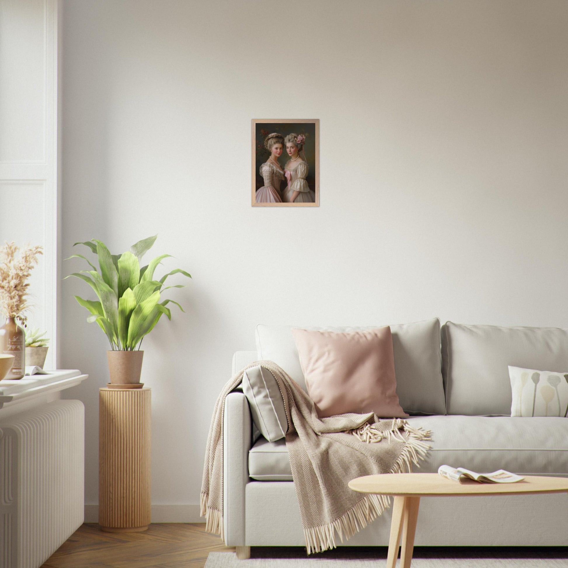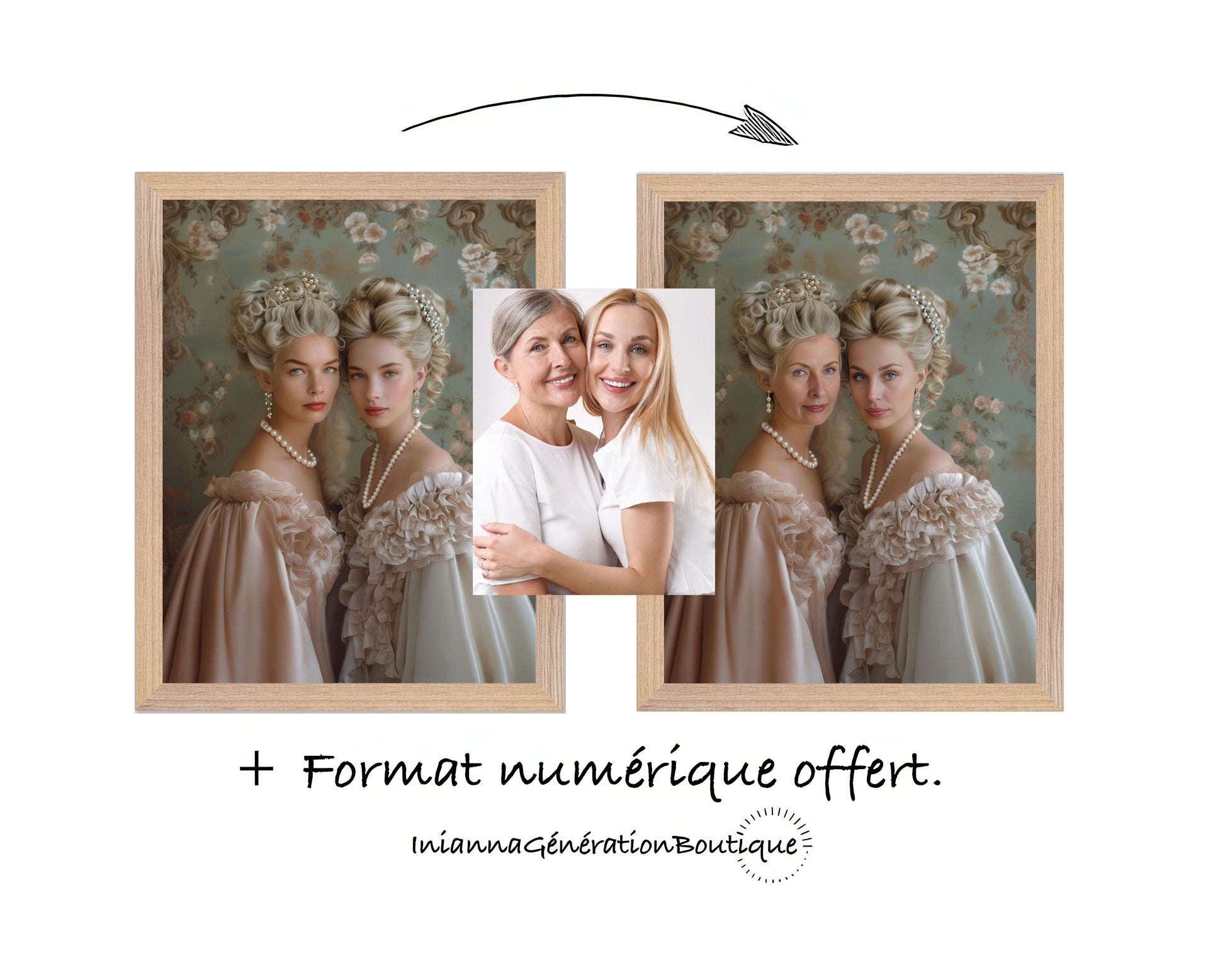 Conçue comme une illustration artistique contemporaine, cette création s’inspire des codes du néo-classicisme, du réalisme délicat et des influences rococo. La composition équilibrée, la finesse des traits et le soin apporté aux matières rappellent les portraits traditionnels, tandis que la douceur des étoffes, la lumière subtile et les détails perlés évoquent l’élégance décorative du XVIIIe siècle.