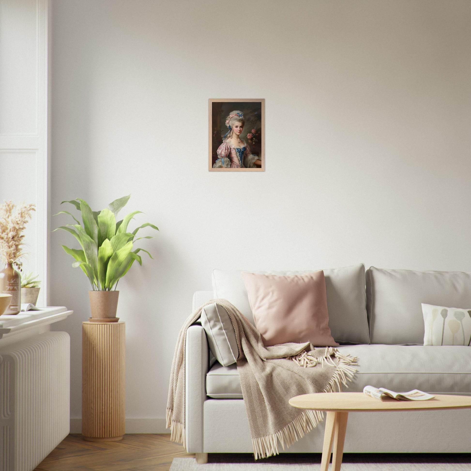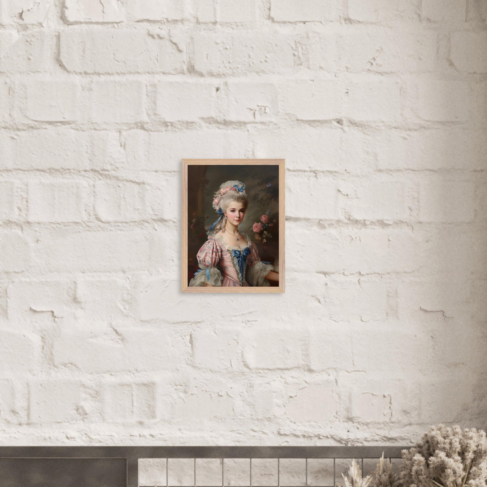 Conçue comme une illustration artistique contemporaine, cette création s’inspire des codes du réalisme délicat et des influences rococo. La composition équilibrée, la finesse des traits et le soin apporté aux matières rappellent les portraits traditionnels, tandis que la douceur des étoffes, la lumière subtile et les détails perlés évoquent l’élégance décorative du XVIIIe siècle.