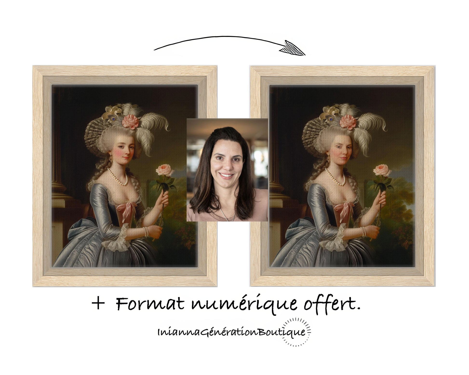 Offrez un cadeau original avec ce portrait au style néo-classique, inspiré des portraits aristocratiques du XVIIIe siècle, dans une esthétique raffinée évoquant l’univers élégant de la série Bridgerton. Vêtue d’une somptueuse robe en velours vert émeraude, rehaussée de broderies argentées et de délicates dentelles crème, elle rappelle les tenues somptueuses de la haute société londonienne de l’époque Régence.