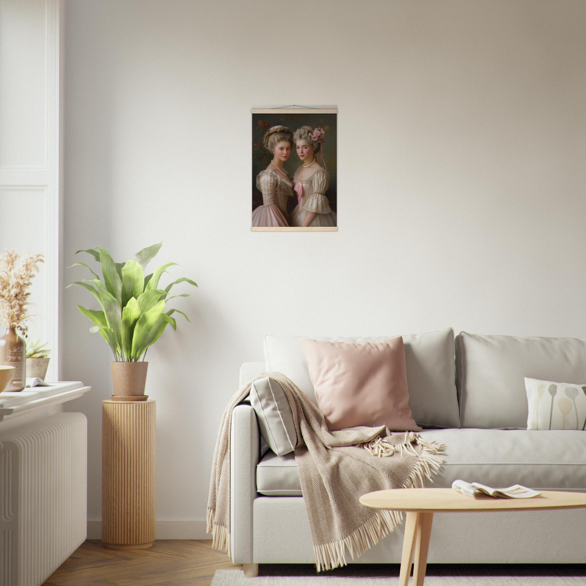 Offrez-vous, ou à un être cher, un portrait personnalisé de deux personnes empreint de grâce classique, où les étoffes ivoire délicatement drapées et les perles majestueuses évoquent une douceur éthérée et intemporelle. Ce poster d’illustration sur mesure, baigné d’une lumière feutrée, capture avec poésie votre lien unique et apporte une touche de noblesse raffinée à votre intérieur.